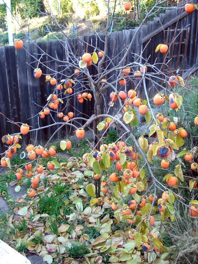 Northern California is a good area for persimmons (can you tell?). They are everywhere. Mine is the Hachiya variety, and you have to wait till the fruit is soft to eat it. Otherwise, the astringency will knock you over. The trees get to be really tall, up to 25 feet or more, and at a time of the year when the leaves have fallen and there is little color, it is a delight to see them with their flaming orange fruits, hanging like big ornaments.